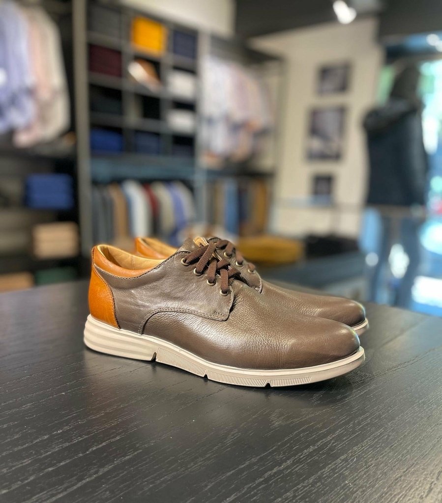 Zapatilla de 100% cuero con detalle en la parte trasera en contratono, con suela de goma.